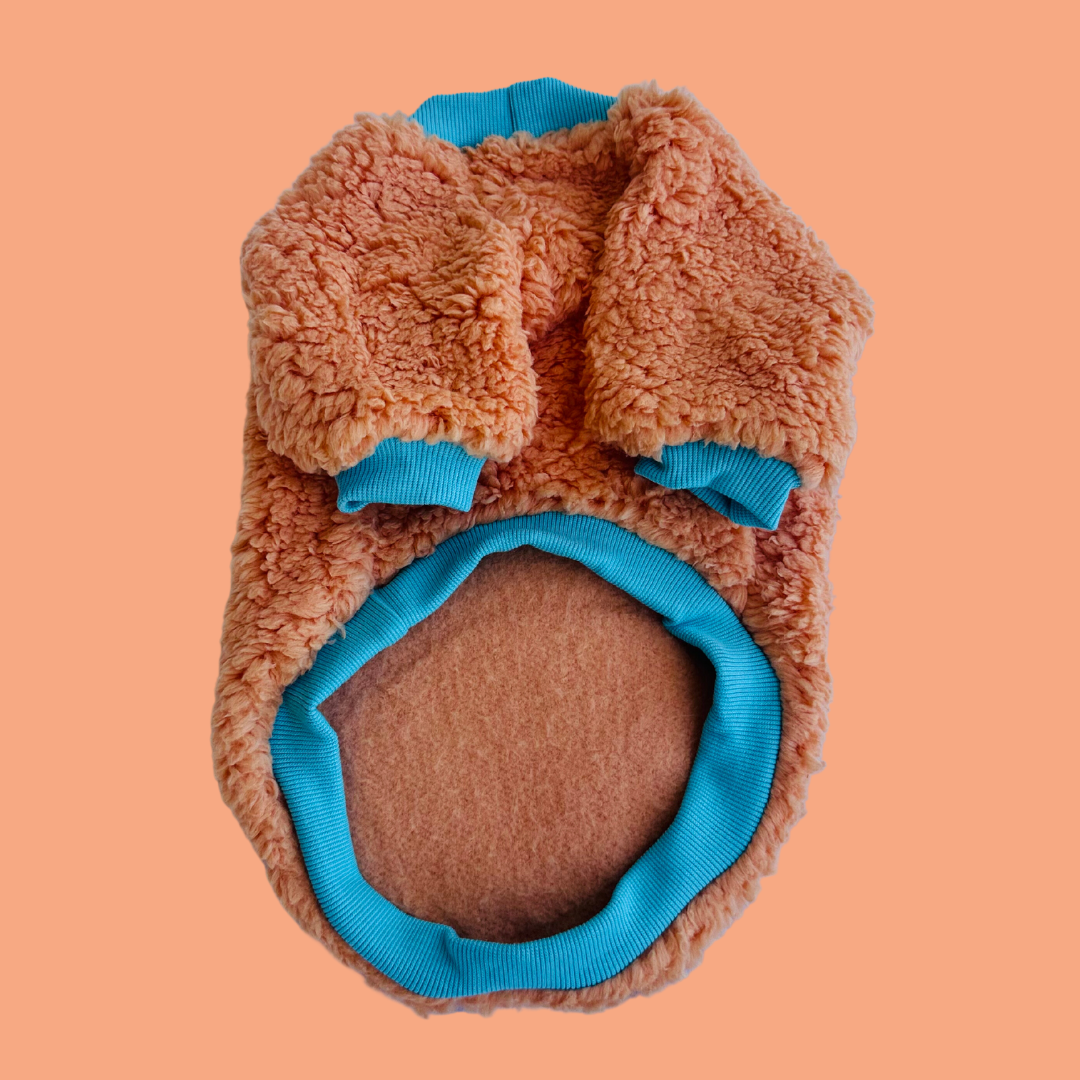 The cutest of cute. Our Mandarin Fluffy Sweater with aqua trim.